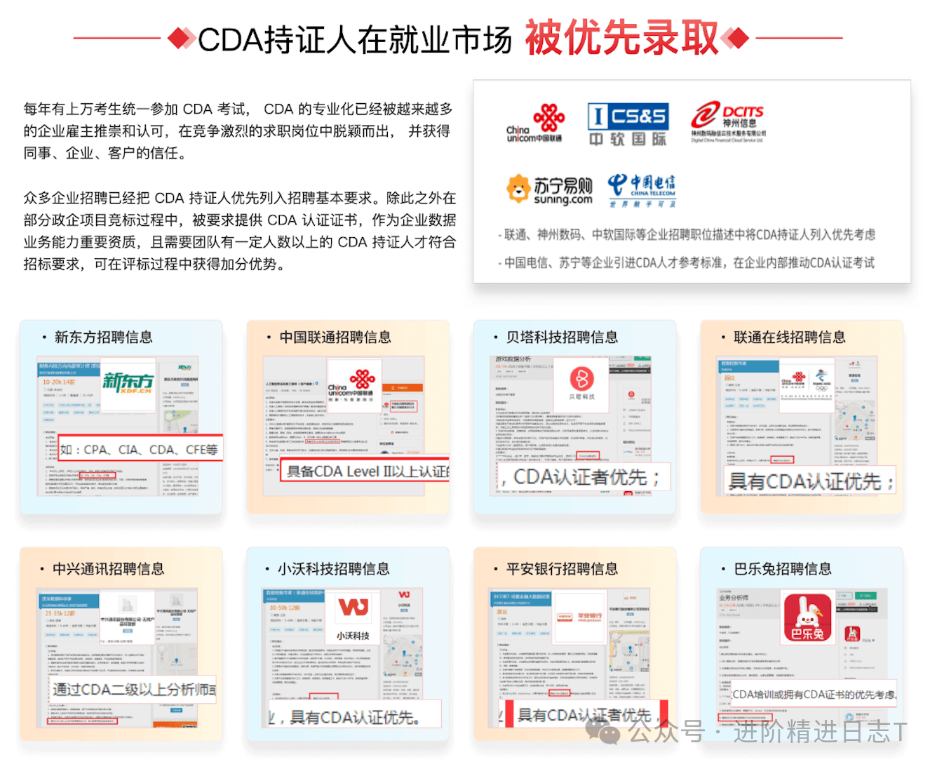 ✅CDA企业承认度若何?CDA企业承认度很是高,良多企业聘请时说明CDA数据阐发师优先,对找工做很是有帮帮。良多银行、金融机构的手艺岗会要求必需是CDA数据阐发师二级以上的持证人。中国联通、央视广信、德勤、苏宁等企业,