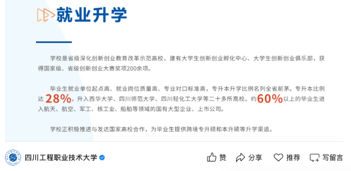 大师遍及都认为职业本科正在社会承认度方面要比通俗本科差一大截,所以即便职业本科也是公办本科,仍是有良多人不太情愿报考。不成否定,当前,我国职业本科相关系统、轨制确实有一部门还不敷完美,可是我也不得不认可的一点是,正在就业方面,良多职业本科完全不输通俗本科,以至比211和985高校都要好!学校最新的就业数据显示,结业生有60%以上都正在航空、航天、军工、核工业、船舶等范畴的国有大型企业和上市公司就业!